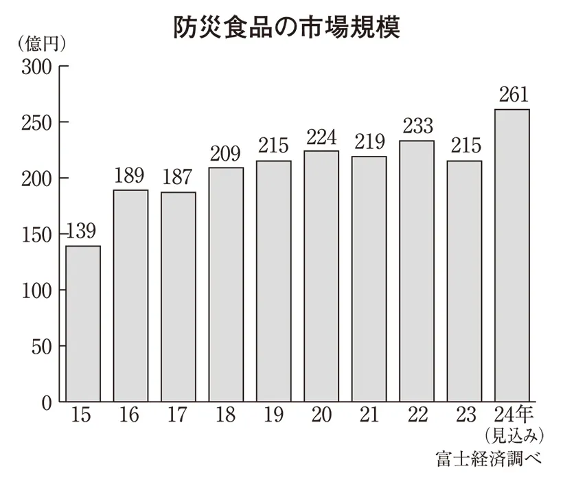 備蓄食料の市場は、企業や自治体などでの購入が活発化している背景もあり、2023年時点では10年間で約1.5倍に成長しています。